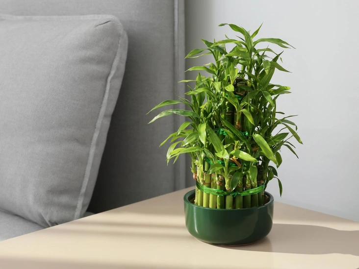 Официальное название этого растения семейства спаржевых — Драцена Сандера, а «бамбуком счастья» его прозвали за толстые стебли, напоминающие настоящий бамбук. И Васту-шастра, и фэншуй связывают это растение с удачей, богатством и крепким здоровьем. Кроме того, Драцена Сандер — прекрасный очиститель воздуха. Предпочтительно держать «бамбук счастья» в восточном углу помещения (читайте также: Домашние помощники: 3 растения, которые помогают содержать квартиру в чистоте).
