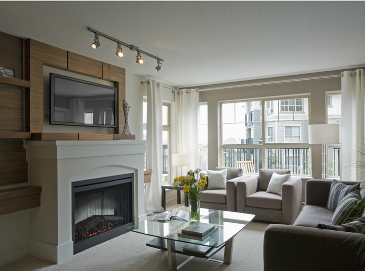 По типу установки камины делятся на встроенные, настенные, напольные, угловые, островные и даже настольные . Для типовых квартир подойдут пристенные: камин можно установить под телевизором и смотреть на пламя с того же дивана.