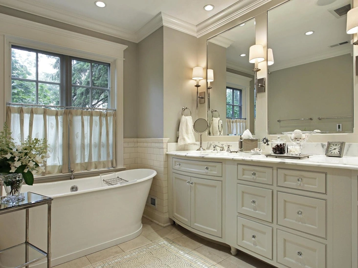 По возможности стоит сочетать в ванной теплые и нейтральные источники света. Теплые должны располагаются непосредственно над ванной или душем для комфортного отдыха и релаксации, нейтральные — в остальной части помещения. Если нет возможности сочетать разные источники света, лучше остановиться на теплом белом — он универсален для любой деятельности и ситуации.