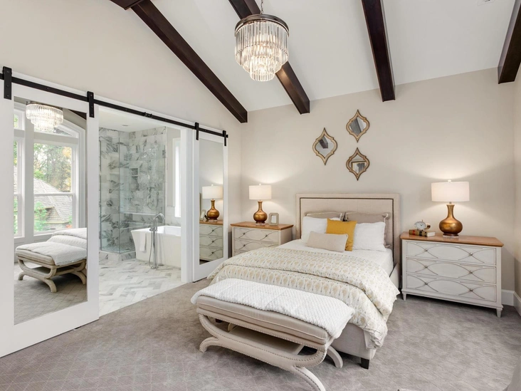 Освещение в этой комнате должно создавать комфортную и расслабляющую атмосферу, иначе пользователи будут испытывать дискомфорт и, возможно, даже проблемы со сном. Организация света в спальне строится по следующим правилам. Основная люстра должна быть с теплым свечением (при желании ее можно заменить встраиваемыми светильниками). Лучшим вариантом станут устройства с диммером, свет которых можно приглушить до минимума.