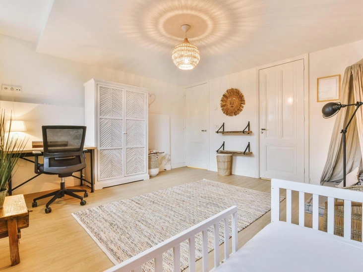 В игровой и рабочей зоне должны находиться нейтральные источники света. При необходимости их можно локально дополнить теплыми светильниками. В качестве альтернативы классическим прикроватным светильникам можно использовать декоративное потолочное освещение. Это экономично, а еще позволяет регулировать цвет и яркость. Для письменного стола нужно подбирать простые и безопасные точечные светильники. Важно, чтобы такие устройства регулировались по высоте, яркости и направлению светового потока. Холодные источники света в детской лучше не использовать. Они могут вызвать раздражительность и усталость.