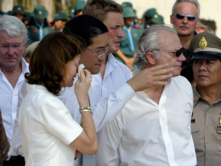 На этом снимке видно, как королева Швеции вытирает слезы, пока министр иностранных дел Таиланда Суракиарт Сатиратаи рассказывает им с Карлом XVI Густавом о смертельных волнах цунами в конце траурной церемонии в разрушенном здании курортного городка Blue Village, где также погибло огромное число шведов. Король и королева Швеции находились в Таиланде с трехдневным визитом, чтобы выразить свою благодарность за гостеприимство, оказанное шведам, пострадавшим от разрушительного цунами в Азии.