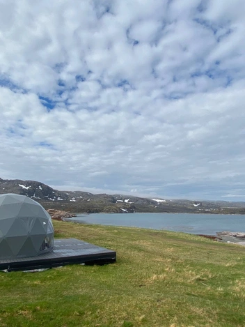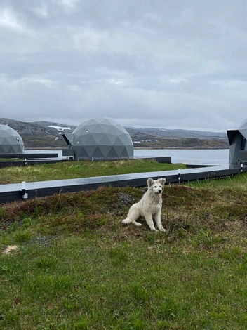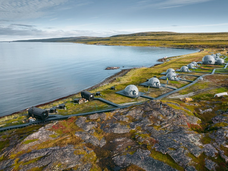 Останавливаясь в очередной раз, чтобы сфотографировать вид (в первые пару часов уж очень сложно перестать удивляться каждому метру), можно заметить, как на укромном берегу Баренцева моря расположились некие сферы, которые издалека напоминают нечто иноземное. Хотя в действительности «Китовый берег» — пространство, максимально органично вписавшееся в местную природную зону.