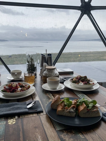 Одно из любимых мест — большая сфера-глэмпцентр, место встречи, где вы завтракаете, обедаете, ужинаете, да и просто собираетесь у камина, чтобы провести время вместе. Всего за несколько дней кажется, что и гости, и команда глэмпинга — одна дружная компания, которой всегда есть, что обсудить и над чем посмеяться. Вообще персонал — отдельная звезда «Китового берега», в которой точно кроется секрет формулы успешного проекта.
