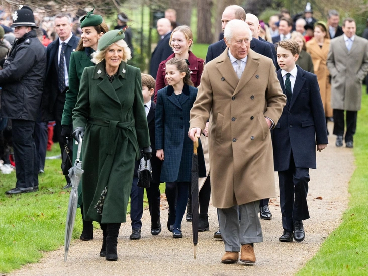 Принцесса Кэтрин, принц Уильям, королева Камилла, король Карл III, принц Джордж, принцесса Шарлотта и принц Луи посещают рождественскую утреннюю службу в церкви Святой Марии Магдалины, 25 декабря 2024