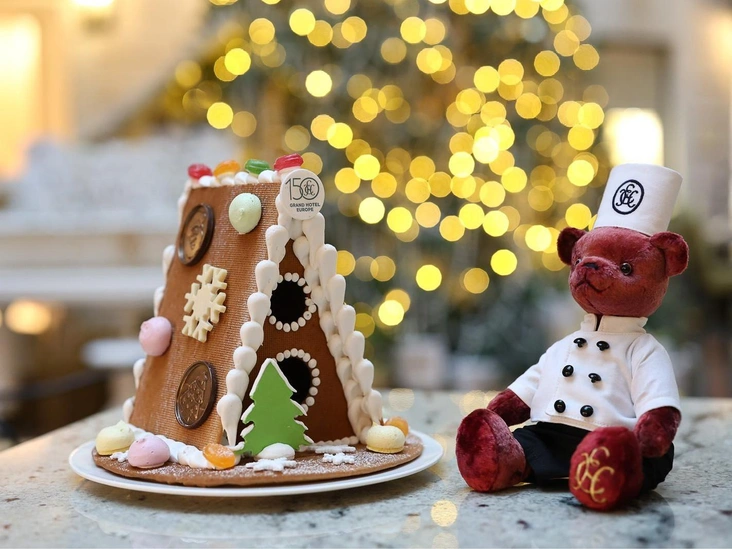 Прекрасным украшением праздничного стола послужат торты, которые создают кондитеры Гранд Отеля Европа: «Заснеженный лес» — мусс и конфи из черной смородины, «Имбирный пряник» — карамельный мусс с молочным шоколадом, а также «Новогодний экспресс» — шоколадный мусс с начинкой мандарин — мята и крем из молочного шоколада.