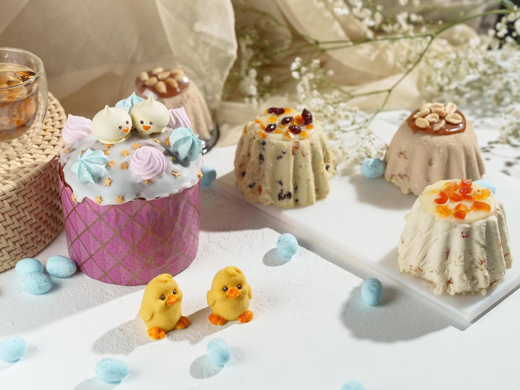 Пасхальный набор «Семейный» состоит из сливочных мини-кексов и большого ароматного кулича с вымоченным в ликере изюмом Gold и лимонной цедрой. Декор выполнен из имбирных пряников собственного производства, бисквита и сублимированной малины. Для ценителей изысканных десертов бренд представил уже полюбившийся кулич с фисташковым кремом. В пасхальную коллекцию также вошли апельсиновый пасхальный кекс, порционные мини-кексы, творожные пасхи в классическом варианте и во вкусе три шоколада.