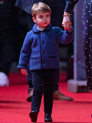 Синяя шерстяная куртка с округлым воротничком, темным кантом и пуговицами Amaia перешла от Джорджа, которого видели в ней по пути на рождественский ланч Ее Величества в Букингемском дворце в 2016-м, к его младшему брату Луи, надевшего ее на предрождественскую пантомиму в лондонском театре Palladium в 2020-м.