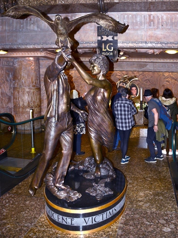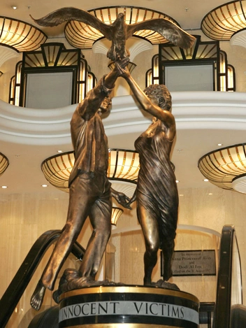 Через семь лет рядом возникла скульптура, изображающая Доди и Диану в легкой одежде танцующими на пляже. Рядом с их соединившимися руками пролетает альбатрос, символизирующий «свободу и вечность». Дизайн композиции под названием «Невинные жертвы» был разработан Уильямом Митчеллом, а отливали из бронзы ее с использованием старинных методов в Литейном цехе бронзового века в Восточном Лондоне. Композицию дополнил египетский ансамбль эскалаторов магазина, спроектированный тем же скульптором. Тем не менее, статуя вызвала серьезную критику и неоднократно была названа «безвкусной». В январе 2018 года Harrods объявили, что вернут статую семье Аль-Файедов, которые продали универмаг правлению по инвестициям Катара в 2010-м. Говорят, что решение было вызвано стремлением новой дирекции магазина вновь стать королевскими поставщиками, ведь Harrods оставался обладателем королевского ордера с 1913 по 2000 год.