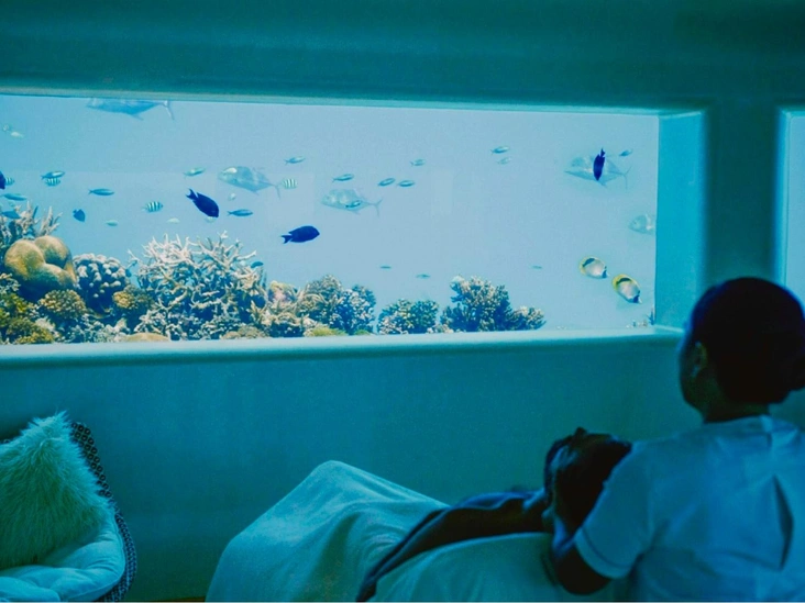 Для тех, кто хочет не просто расслабиться, а сделать это в контексте уникальности, Huvafen Fushi предлагает первый в мире подводный SPA-комплекс. Процедуры проводятся в помещении с панорамными окнами — да-да, вы буквально лежите на кушетке, а вокруг — коралловые рифы, рыбы, акулы и бесконечный океан. Все абсолютно бесшумно, визуально приятно, и с мягкой подсветкой и расслабляющей фоновой музыкой. А еще — по записи. Никакой спонтанности. Только точный график. Это относится и к другим активностям, будь то сноркелинг, ужин в уникальном винном погребе или любая другая спа-активность.