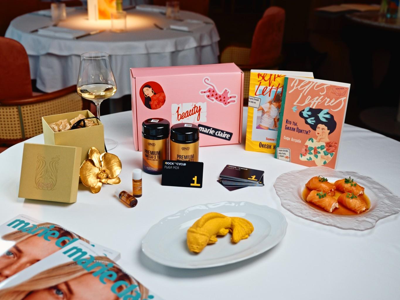 Среди приятных сюрпризов — уходовый тонер Ma: nyo, витамины Premium Omega-3 TG, сертификаты от KLEVER JEWELRY и студии Rock the Cycle, книги издательства «Бель Летр», а также весенний номер Marie Claire и фирменный косметический бокс.