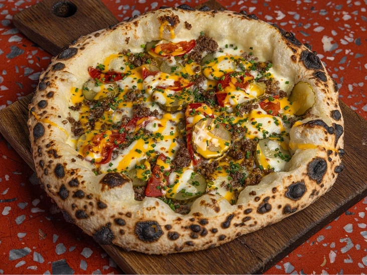 Весеннюю шефскую пиццу представил Камель Бенмамар — создатель Kamel Smash Burger и заметная фигура московской гастрономии. Его версия — это смэш-бургер, «пересобранный» в пиццу на неаполитанском тесте: картофельный бешамель, фарш, сырный соус, соленые огурцы, томаты и карамелизированный лук.