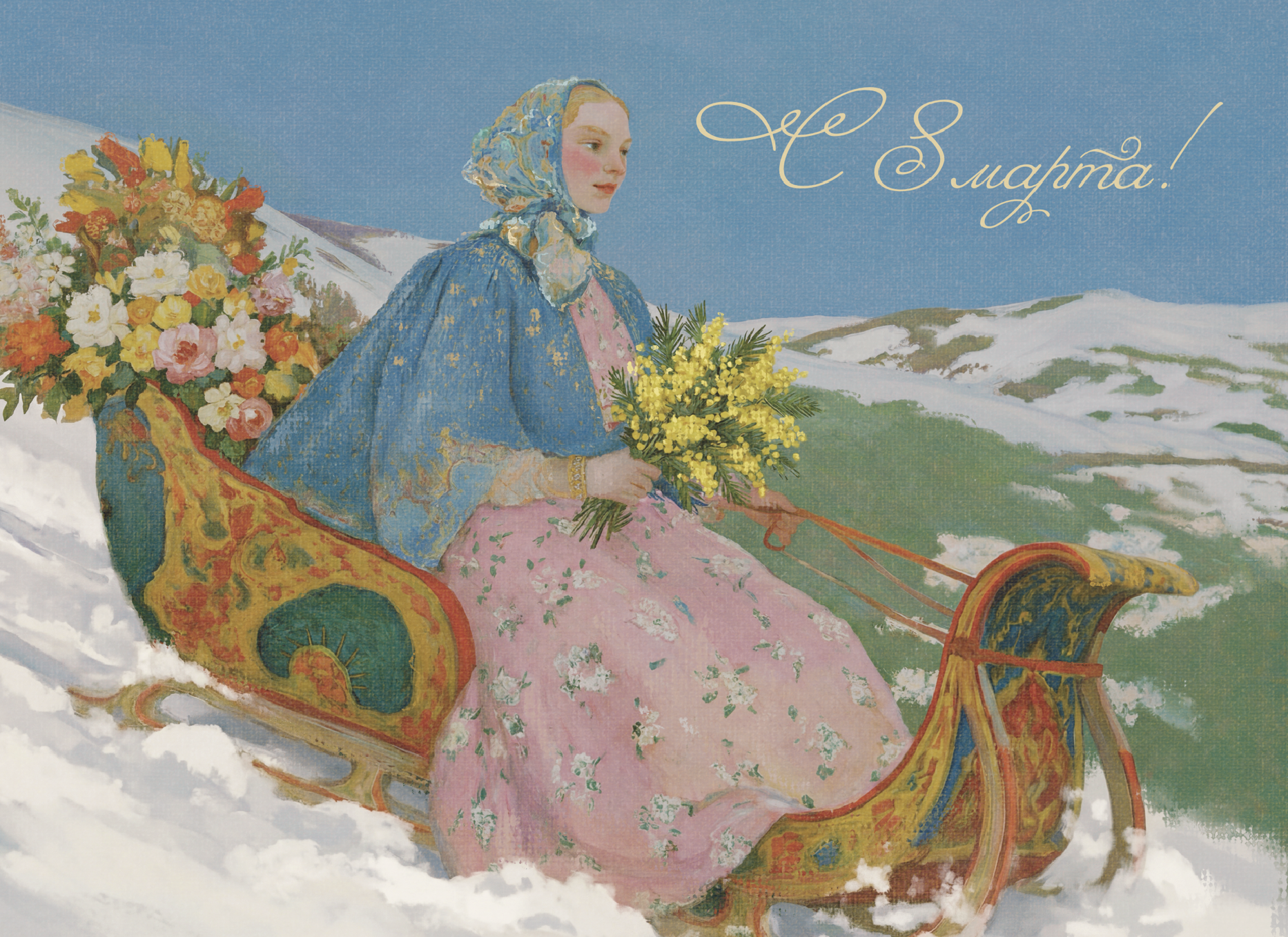 Для проекта создали эксклюзивный дизайн: на открытке озорная девица в кокошнике мчится на расписных санях, увозя с собой зиму и привозя первое солнце. Поэтичный сюжет отсылает к русским традициям и превращает поздравление в маленький весенний привет с настроением сказки.