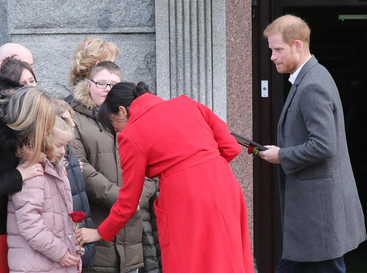 Его Высочество склонен переживать за супругу даже в ситуациях практически полного отсутствия угрозы. Так, когда Меган спонтанно остановилась, чтобы взять розу у маленькой девочки, Гарри развернулся и судя по его сжатым губам несколько напрягся. По мнению Джеймс, это указывает на беспокойство или подавленную тревогу Его Высочества.