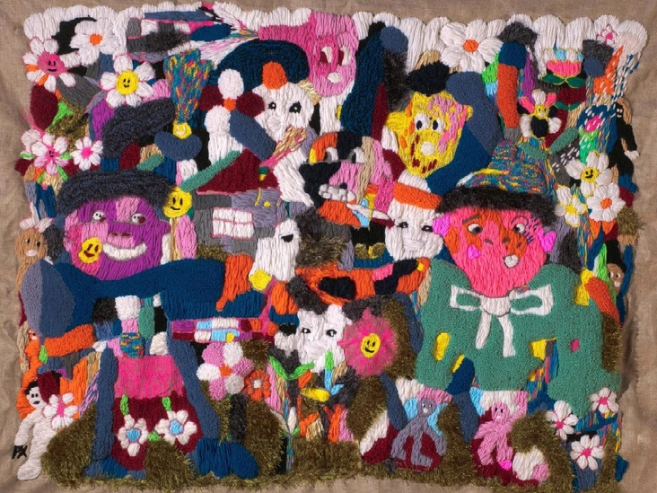Художник и иллюстратор Рома Peeks комбинирует в своей практике самые разные техники. Образы, которые создает художник — это яркие орнаменты, где все персонажи и мотивы переплетаются. Представьте себе большой холст, на котором вышивается целый сюжет с сюрреалистическими персонажами, или яркий, совершенно невообразимый ковер, созданный по мотивам фантазий художника. Смысл работ всегда ироничен, а в свою вышивку Рома закладывает возможность тактильной коммуникации — одной из важных форм чувственного восприятия.