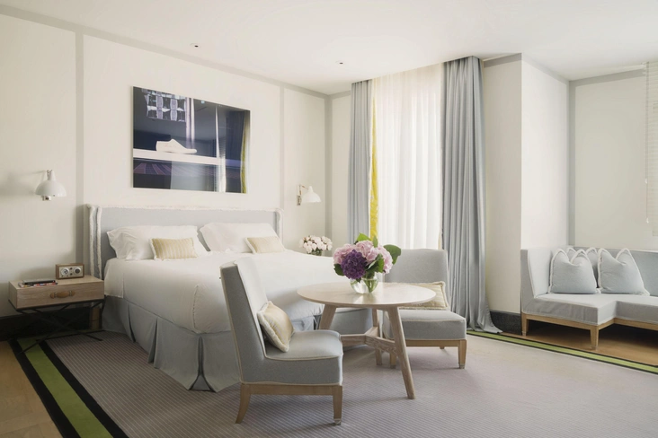 Здесь даже рисунок портьер напоминает об узорах туфель, а сама цветовая палитра отеля собрана в стиле тихой роскоши — оттенки кремового, сливочного, цикламена, изумрудно-зеленого и более теплые тона дерева, бархата и кожи.