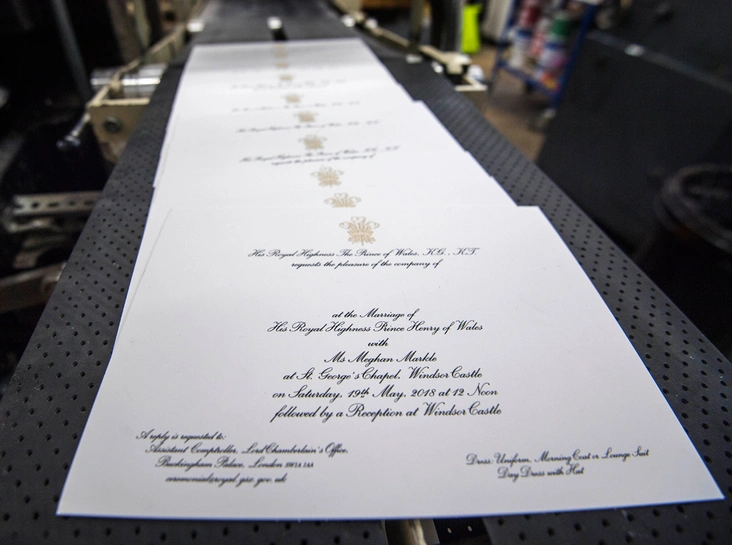 По традиции все карточки были отпечатаны в лондонской типографии Barnard Westwood – эта фирма занимается созданием приглашений на королевские свадьбы с 1985 года. «Использованы американские чернила на английских карточках, – говорится в сообщении Кенсингтонского дворца. – Пригласительные отпечатаны черными чернилами и тиснены золотом на полированной бумаге с золотой кромкой».