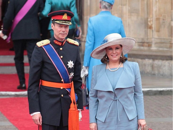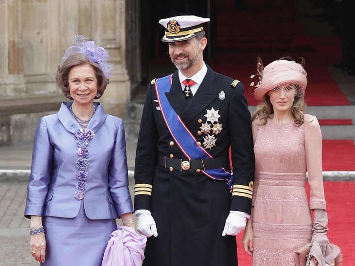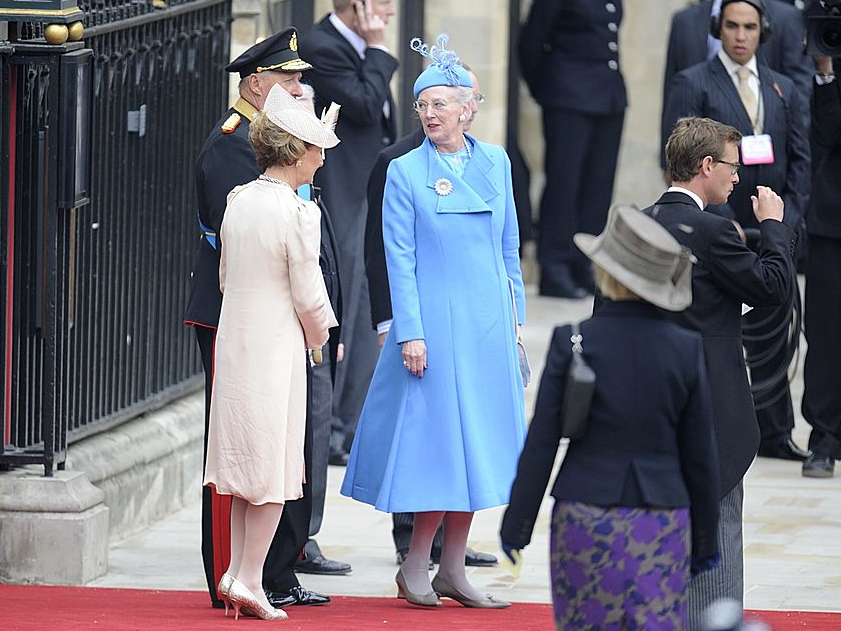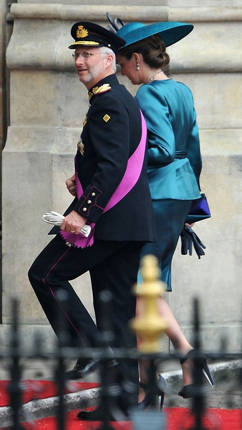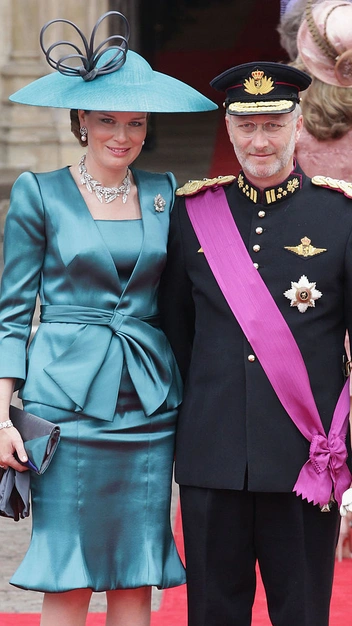 Бельгийский монарх прибыл на свадьбу в национальной военной униформе с пурпурной лентой. Его супруга, королева-консорт Матильда, выбрала изумрудный атласный костюм с юбкой до колен и фантазийную шляпку.