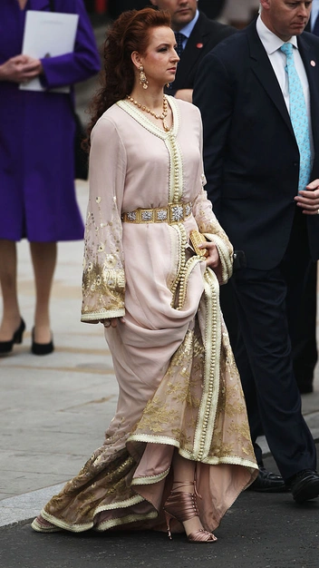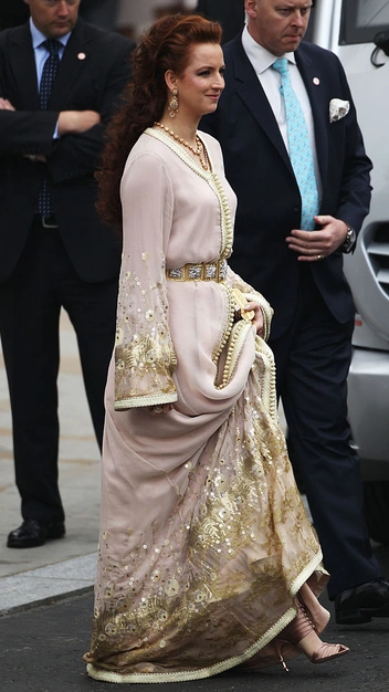 Образ супруги короля Мухаммеда VI стал одним из самых запоминающихся на свадьбе. Лалла Сальма появилась в национальном платье с летящим подолом, расшитым позолотой. Наряд дополняли изящные босоножки с лентами. Уместным акцентом стали и массивные золотые украшения, которые не отвлекали от платья, но добавляли образу еще больше национальных марокканских мотивов.