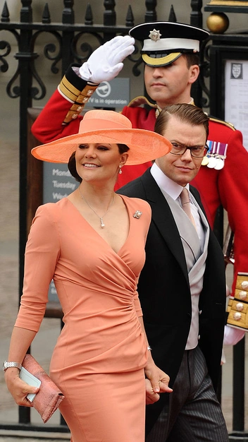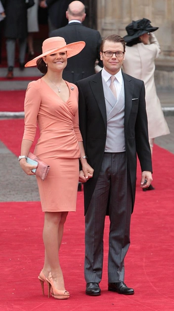 Шведская королевская чета была в списке самых почетных гостей. Кронпринцесса Виктория появилась в облегающем платье кораллового оттенка со шляпкой и туфлями в тон. Ее супруг, принц Даниэль, был в традиционном фраке, разбавив черный цвет пастельно-голубым жилетом и галстуком перекликающегося с нарядом жены оттенка (читайте также: Шведская сказка: 7 фактов о свадьбе кронпринцессы Виктории и принца Даниэля).