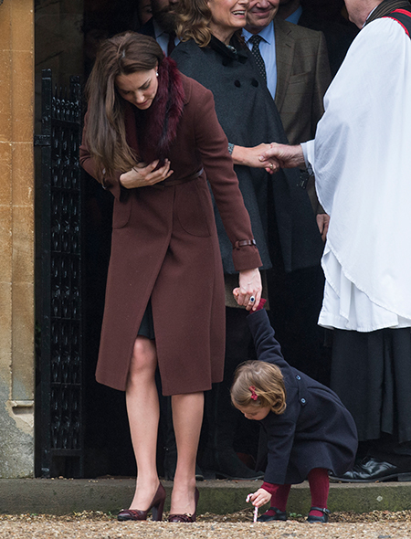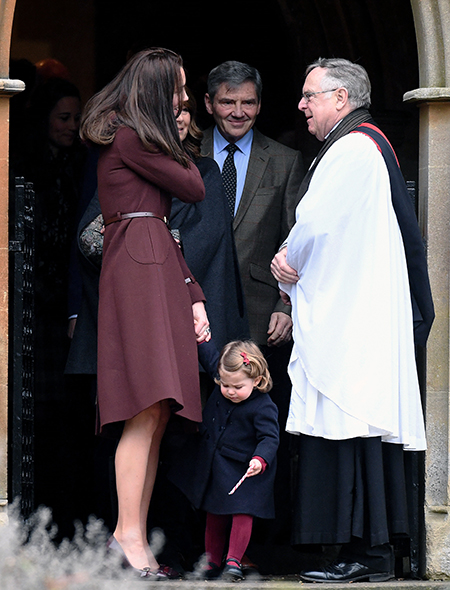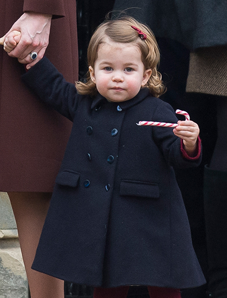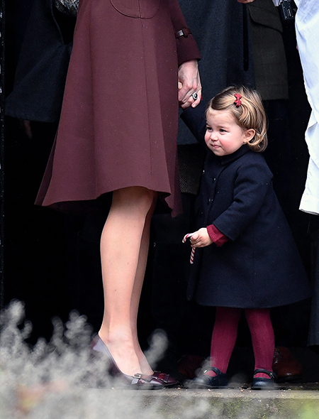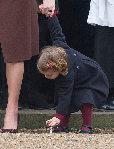Утром 25-го декабря Кейт и Уильям вместе с Миддлтонами посетили рождественскую службу в церкви, взяв с собой и малышей. Юная Шарлотта охотно позировала на выходе из храма с леденцом в руках. Он то грызла его, то вдумчиво ковыряла им крыльцо церкви на виду у зазевавшейся мамы.