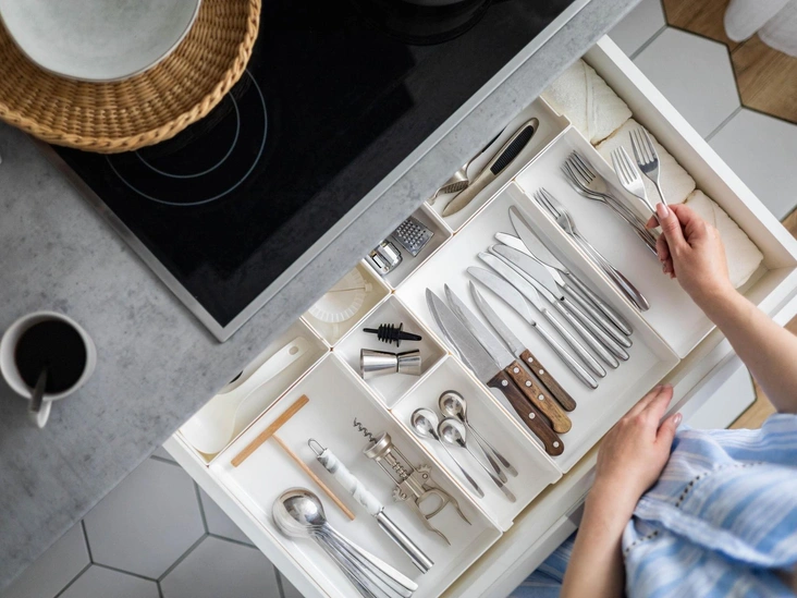 Если вы хотите организовать кладовую или пытаетесь упорядочить содержимое кухонных шкафов, есть вещь, без которой вам не обойтись: это контейнеры и разделители ящиков. Конечно, совет не слишком новаторский, но есть несколько нюансов. В интервью Ideal Home редакция спросила Мари Кондо, каковы ее главные принципы организации кухни. Она ответила: «На кухне так много мелкой посуды и приспособлений, и, это действительно просто, но разделение ящиков с помощью разделителей и контейнеров — это то, что действительно меняет кухню, потому что это дает понимание, где что живет». Эксперт по уборке добавила: «Это то, без чего я просто не могу».