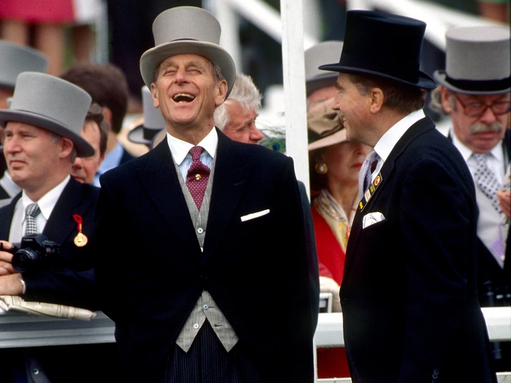 На этом снимке принц Филипп запечатлен смеющимся во время разговора со своим другом лордом Карнарвоном, менеджером королевских гонок, на скачках в Эпсоме в 1993 году.