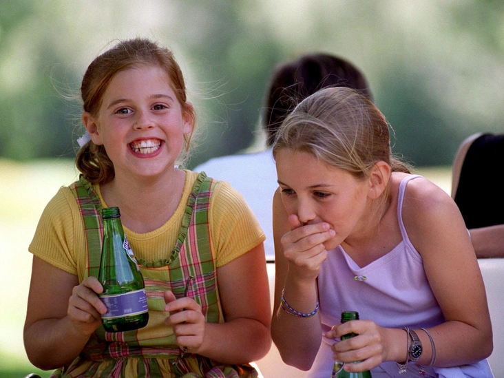 На этом снимке принцесса Беатрис запечатлена с ее школьной подругой Лаурой Галлахер во время благотворительного турнира по гольфу в гольф-клубе Wentworth в графстве Суррей. Девочек развеселили их собственные попытки добиться мелодии, дуя в горлышко стеклянных бутылок с водой.