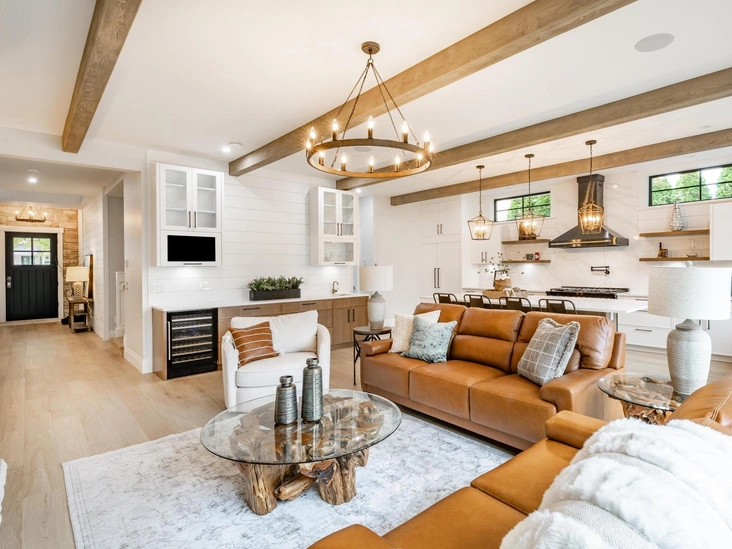 В минимализме или скандинавском стиле отлично смотрятся гладкие поверхности или деревянные панели. Сюда могут выигрышно вписаться и фальшь-балки под дерево, но используя такие решения, нужно считаться с размерами квартиры. Для маленьких пространств и низких потолков лучше избегать сложных конструкций. Даже если впишутся по стилю, они будут давить своими габаритами. Это вряд ли тот эффект, которого вы хотели.
