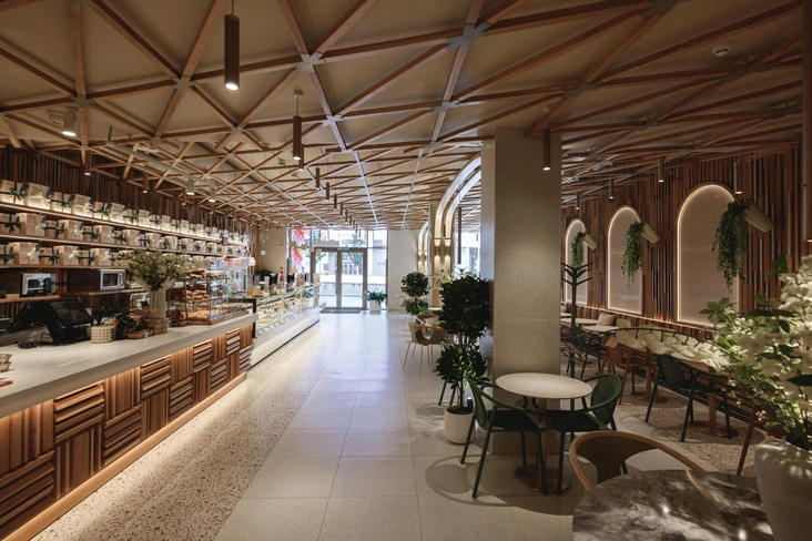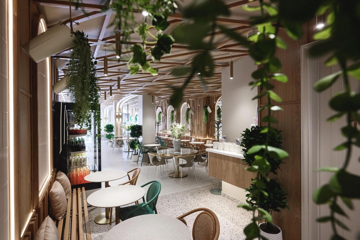 «Такие же арки можно наблюдать и на стенах (а в них — керамическую плитку нежно-розового оттенка, которая притягивает внимание с первого взгляда, ассоциируясь с чем-то зефирным и съедобным). Из цветовых решений основной акцент сделан на чисто белом цвете и декоре (хотя обычно в интерьере используем кремовые и бежевые тона). Ноу-хау можно встретить и в отделочных материалах. В этот раз было решено смешать две породы дерева. Помимо привычного всем бука (природного розоватого оттенка), в „Бруснике“ можно увидеть панели из дуба. Эта порода дерева выглядит элегантно и обладает красивым зеленоватым подтоном. А еще в интерьере кафе гостей ждут невероятно изящные латунные светильники, придающие пространству уют и особый шарм», - заключили Юлия и Павел.