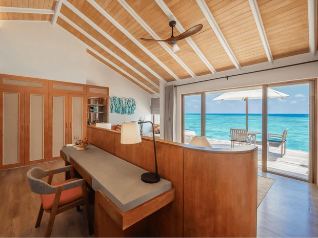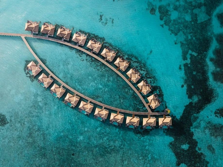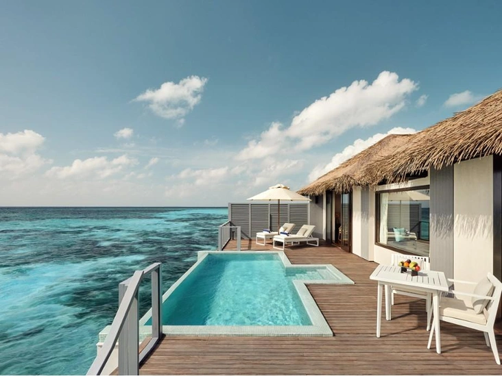 Курорт окружен бирюзовыми лагунами и тропической зеленью и предлагает 50 пляжных и надводных вилл, многие — с собственными бассейнами. Интерьеры построены на балансе современного комфорта и натуральных островных материалов, создавая ту самую barefoot luxury — расслабленную, неброскую и очень честную.