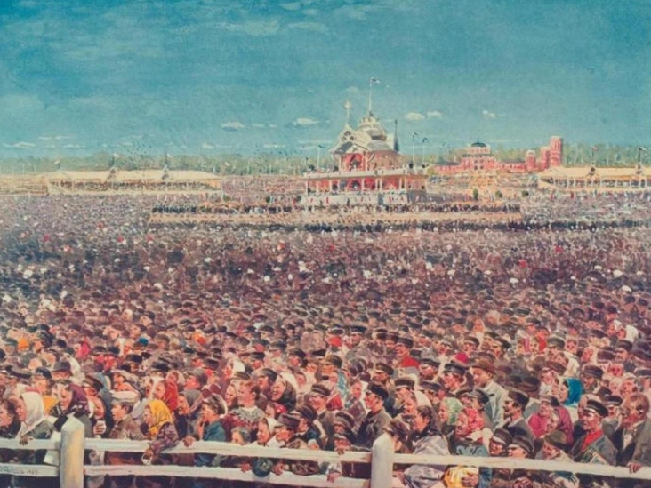 Именно желание заполучить такие чудесные подарки и стало для многих решающим фактором, чтобы посетить Ходынское поле 18 мая. Накануне празднеств ажиотаж достиг своего апогея. Стали ходить слухи, что на мероприятии установят бездонные тары с пивом и вином, которые, словно фонтан, будут бить из-под земли, а публику будут развлекать слоны и птицы, обученные грамоте. Это, разумеется, также подстегнуло людской интерес. И уже 17 мая вечером гости стали стекаться к Ходынскому полю. К рассвету их набралось около 500 тысяч — так много, что двигаться они уже не могли, превратившись в единую крепкую стену. «Все кишело народом. Гомон и дым стояли над полем», - вспоминал Гиляровский.