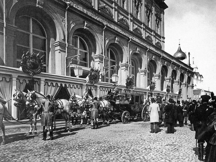 «С крыльца спустился взвод молодцеватых кавалергардов, зазвучали трубы и литавры. На террасах дворца — блестящая масса придворных, представителей волостей, городов, земств, дворянства, купечества, профессора Московского университета, за ними обер-прокуроры сената, сенаторы, статс-секретари, министры и члены Государственного совета. Наконец, при оглушительных восторженных криках „ура“ стотысячных масс и звуках „Боже, царя храни“, исполняемого придворным оркестром, на Красном крыльце показывается Государь Император и Государыня Императрица», — рассказывалось в газетах того времени.