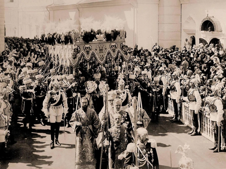 «Великий, торжественный, но тяжкий» день церковного обряда — как писал о нем сам Николай II в своем дневнике — начался шумно. В 7 утра несколько артиллерийских орудий, установленных у Тайницкой башни дали 21 залп, затем раздался долгий перезвон колоколов, ознаменовавший начало церемонии.