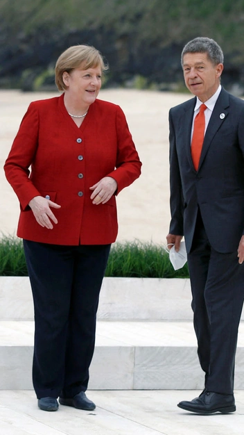 Немецкий канцлер Ангела Меркель привычно для себя появилась в брюках и жакете. Однако ее образ был менее сдержанным за счет глубокого красного оттенка пиджака.