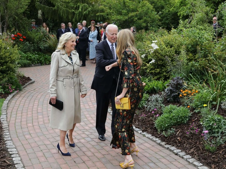 Что касается первой леди США, то для приема в ботаническом саду она выбрала классический бежевый тренч и темно-синие бархатные лодочки. А ранее для встречи с герцогиней Кэтрин подобрала ярко-розовый жакет от L'Agence, белое платье А-силуэта от Akris и бежевые туфли от Valentino. К слову, Джилл и ее супруг, президент США Джо Байден, на саммите впервые встретились с британской королевской семьей и Елизаветой II.