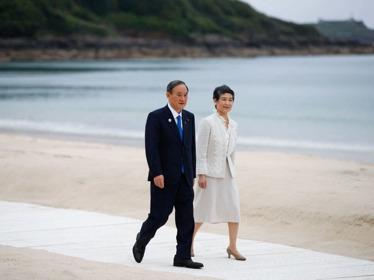 В единой цветовой гамме, светло-бежевой, был выдержан и образ супруги японского премьер-министра Есихидэ Суга, Марико. Она выбрала костюм с юбкой длины миди и жакетом с кружевной отделкой. В итоге комплект получился одновременно строгим, нежным и торжественным.