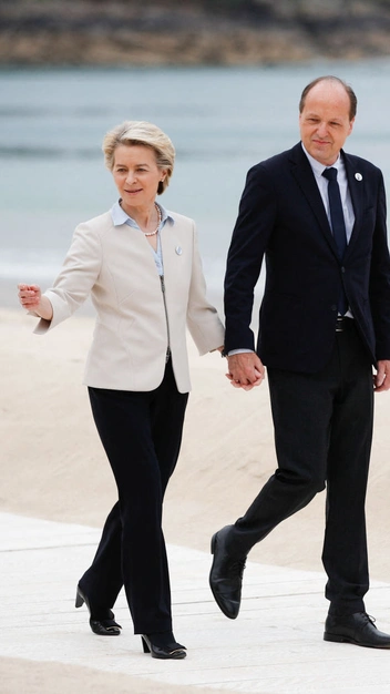 Председатель Европейской комиссии Урсула фон дер Ляйен также отказалась от платья в пользу брюк. Политик подобрала максимально строгий образ: черные брюки со стрелками, светло-бежевый приталенный пиджак и голубую рубашку. Разбавляла общую сдержанность лишь нитка жемчуга.