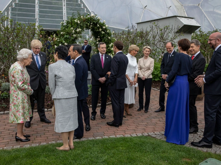 Как утверждают инсайдеры, королева пребывала на приеме в прекрасном настроении и много шутила. Во время совместной фотосессии с лидерами G7 она непринужденно спросила у фотографа: «Нужно выглядеть так, будто тебе все это нравится?». Для мероприятия монарх выбрала платье с цветочным узором, которое хорошо гармонировало с окружающим фоном.