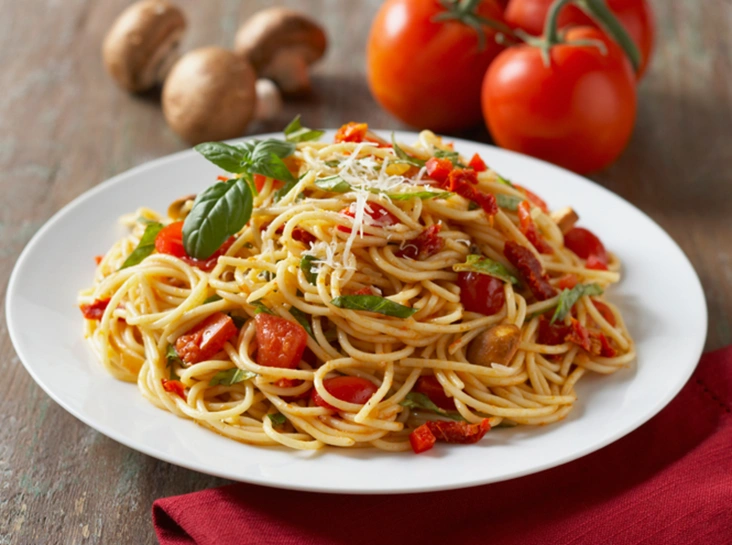В приготовлении пасты всегда используйте большую кастрюлю с таким же большим количеством воды. Добавляем соль и, как только вода закипит, пасту. Тем времнем, на сковороде разогреваем оливковое масло. Необходимо раздавить 5-6 долек чеснока и обжарить их до золотистой корочки. Нарезаем пополам 500 гр помидоров черри, добавляем на сковороду к чесноку и очень быстро обжариваем. Как только они начнут размегчаться, будет выделяться пектин, и текстура будет становиться кремовой, а цвет поменяется с красного на оранжеватый. Сразу же добавляем пасту на сковороду и тщательно перемешиваем. Сервировать можно тертым пармезаном и свежим базиликом. Так, за 15 минут у вас будет полезное и сытное блюдо.