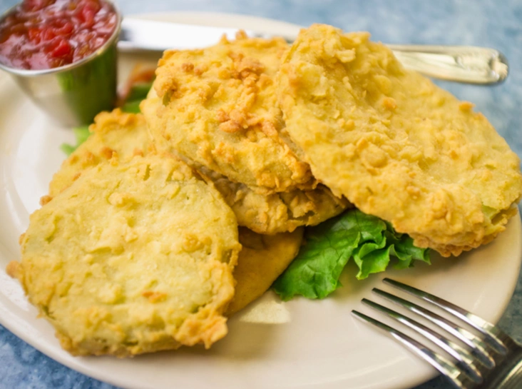 Важно подбирать томаты с плотной текстурой — зеленые (помним, что это сорт, а не степень зрелости!) или розовые. Нарезаем кружками, окунаем сначала в яйцо, затем в муку с солью, обжариваем во фритюре и подаем с моцареллой, анчоусами, перцем и каперсами. Очень простая в приготовлении и необычная на вкус закуска.