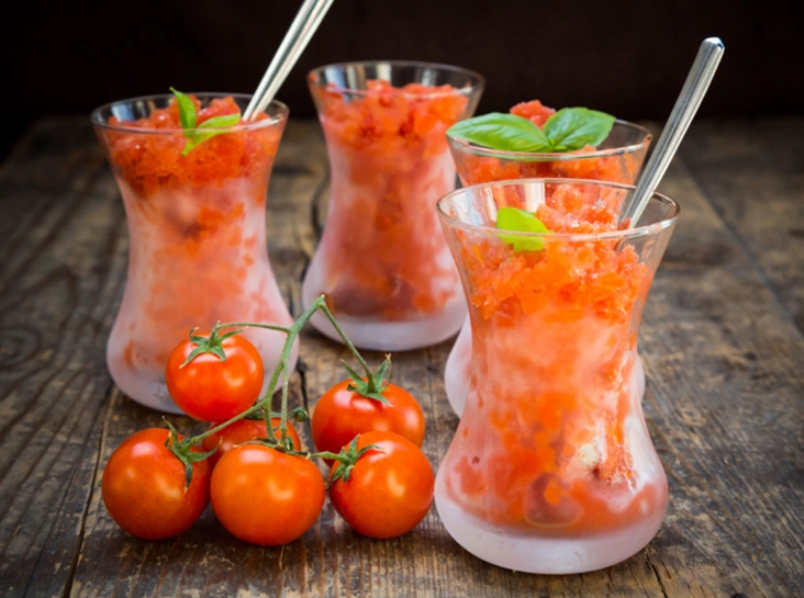 Берем свежие помидоры, делаем сок и процеживаем его. Таким образом, у нас должна получиться только розоватая жидкость без мякоти и семян. Этот отцеженный сок отправляем в морозилку до полного замерзания. Затем мы достаем его, кладем в блендер, добавляем лимонный сок, сахар, яичный белок и перемешиваем. Сорбет готов! Украсить можно веточкой мяты.