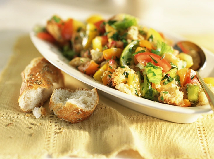 Необходимо использовать зачерствевший хлеб. Натираем его чесноком. Затем погружаем в небольшое количество воды с оливковым маслом, чтобы он размяк. Потом берем слегка переспелые томаты с тонкой кожурой и буквально разрываем их руками. Все тщательно перемешиваем, добавляем соль, базилик, петрушку и мякоть красного апельсина. Получившуюся смесь необходимо спрессовать, и можно подавать. Панзанелла отлично подойдет в качестве аперитива.