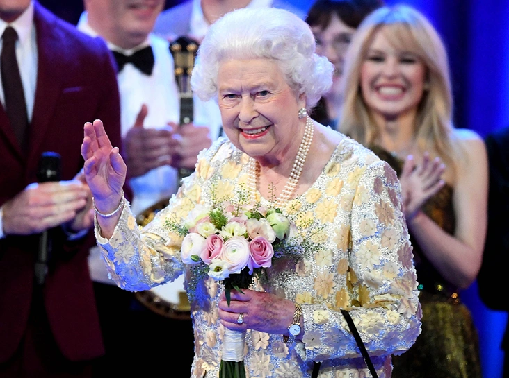 В конце мероприятия все участники концерта собрались на сцене, чтобы поприветствовать Ее Величество и ее старшего сына принца Чарльза, которому выпала честь выступить с заключительными поздравлениями в адрес монархини.