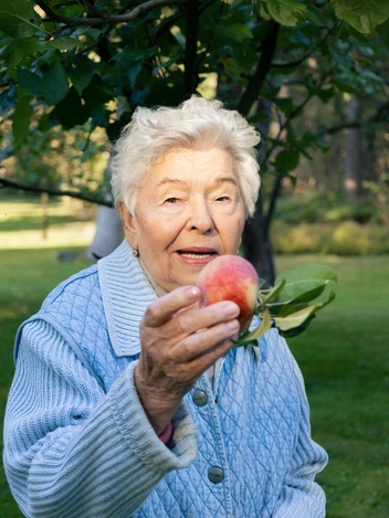 Бабушка любит свой сад. Она много души вложила в него, в то, как все расположить, чтобы было красиво и удобно. Весна и лето — любимые ее времена года, но и осень она любит, потому что яблоки на ее яблонях становятся красными, спелыми, мы можем вместе подойти к дереву — она сорвет яблоко и подарит его мне…