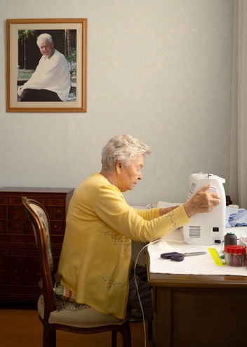 Но по поводу фотографий я еще одну деталь хотела рассказать, она не сразу бросается в глаза. В доме у бабушки есть любимые места — столовая, она там иногда после завтрака или ужина может за столом засидеться, что-то читать или что-то смотреть. Ее кабинет с той самой швейной машинкой. Гостиная. Это всё места, где она проводит больше всего времени в течение дня. И в каждой из этих комнат — портрет дедушки. Каждый портрет разный. Для нее важно, чтобы он был рядом с ней. Без него она не может жить.