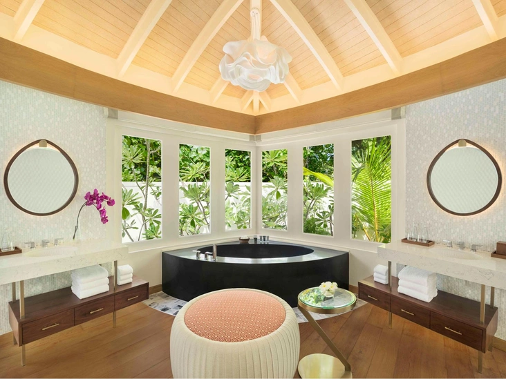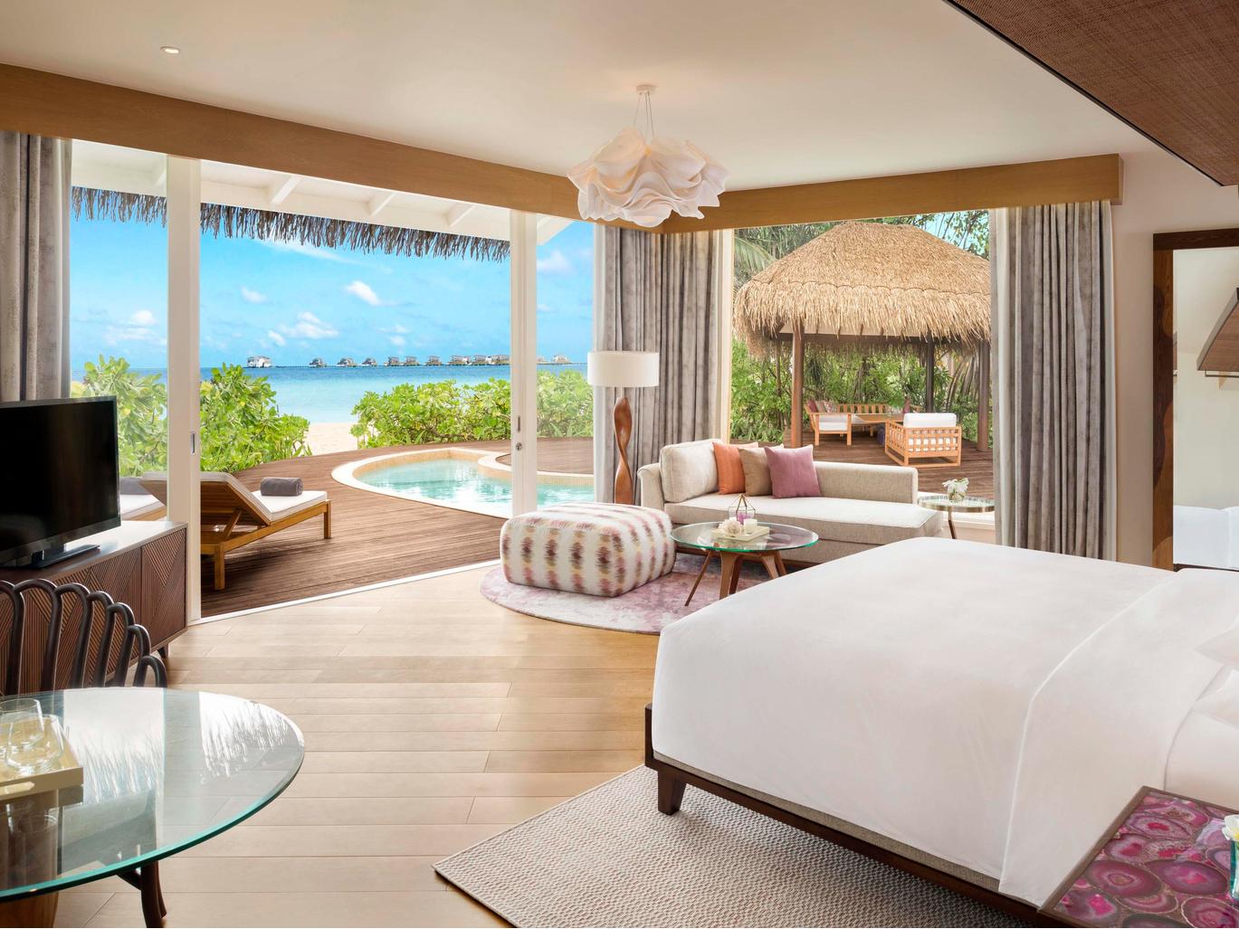 Отель JW Marriott предлагает семьям и большим компаниям (если вы, например, едете отмечать день рождения или девичник) несколько вариантов размещения. В зависимости от количества членов семьи гости курорта могут выбрать виллу или дуплекс на пляже с видом на восход или закат. В интерьерах команда отеля сделала ставку на природные материалы и традиционные мальдивские мотивы: соломенные крыши на виллах напоминают перевернутые лодки дхони, традиционные деревянные рыбацкие суда Мальдив, а скошенные крыши — белых цапель, окунувших голову в воду. Лаконичный дизайн, просторные ванные, терраса и собственный бассейн, скрытый от посторонних глаз, создают атмосферу приватности и спокойствия.