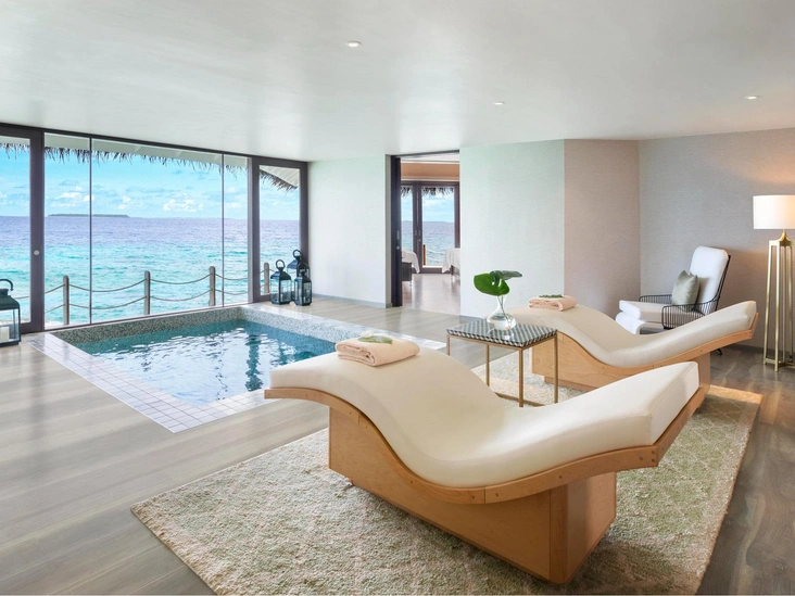 А для пар команда спа предлагает парные сеансы массажа в уединенном пространстве с видом на океан. Помимо массажного кабинета там вы найдете парную, ледяную комнату и небольшой бассейн, которыми вы сможете воспользоваться после процедуры.