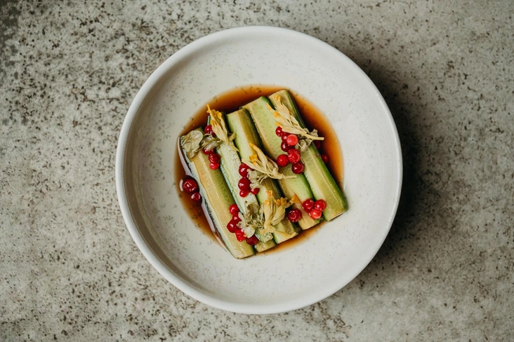 Обновленное меню ENO Bistro вдохновлено богатством природы и традициями предков. Шеф-повар Евгений Цыганов с любовью и мастерством воплотил идеи оригинальной концепции «Собирательство. Охота. Фермерство» в каждом блюде, соединив традиционные способы обработки продуктов и современные кулинарные тренды. Если огурцы — то в квасе и с ферментированными листьями винограда, так называемые «битые огурцы по-русски», а риет — из утки и дикого гуся с айвой, маслом абрикосовых косточек из собственной маслобойни и сеном из жареного лука-порея.