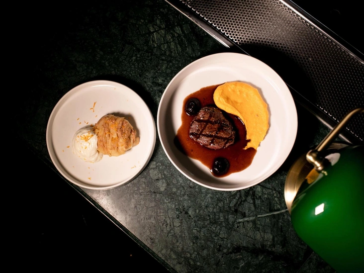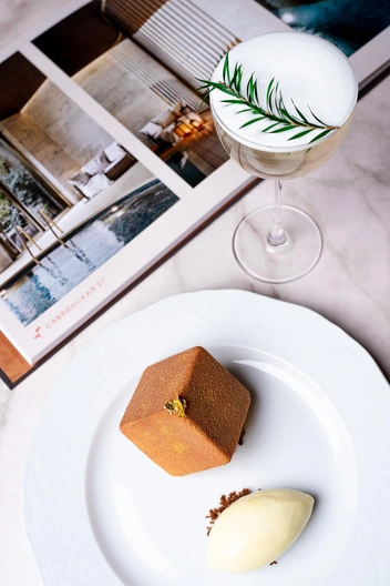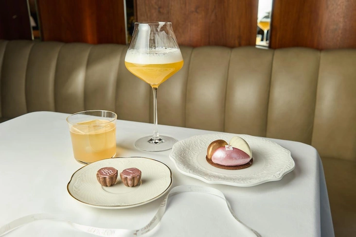Ресторан «Высота 5642» и резиденции делюкс-класса от Level этой зимой создали особенное меню, объединяющее два искусства, где важны талант, вдохновение и точный математический расчет — гастрономию и архитектуру. Главным акцентом стал десерт-куб «Брызги шампанского», сочетающий в себе элегантную простоту четких линий и по-новогоднему изысканный вкус начинки. Под лаконичной формой скрываются желе из шампанского, мусс юдзу и кусочки брауни. Десерт подается на шоколадном крамбле с ганашем юдзу. Грани куба украшены золотом, подчеркивающим его совершенство.